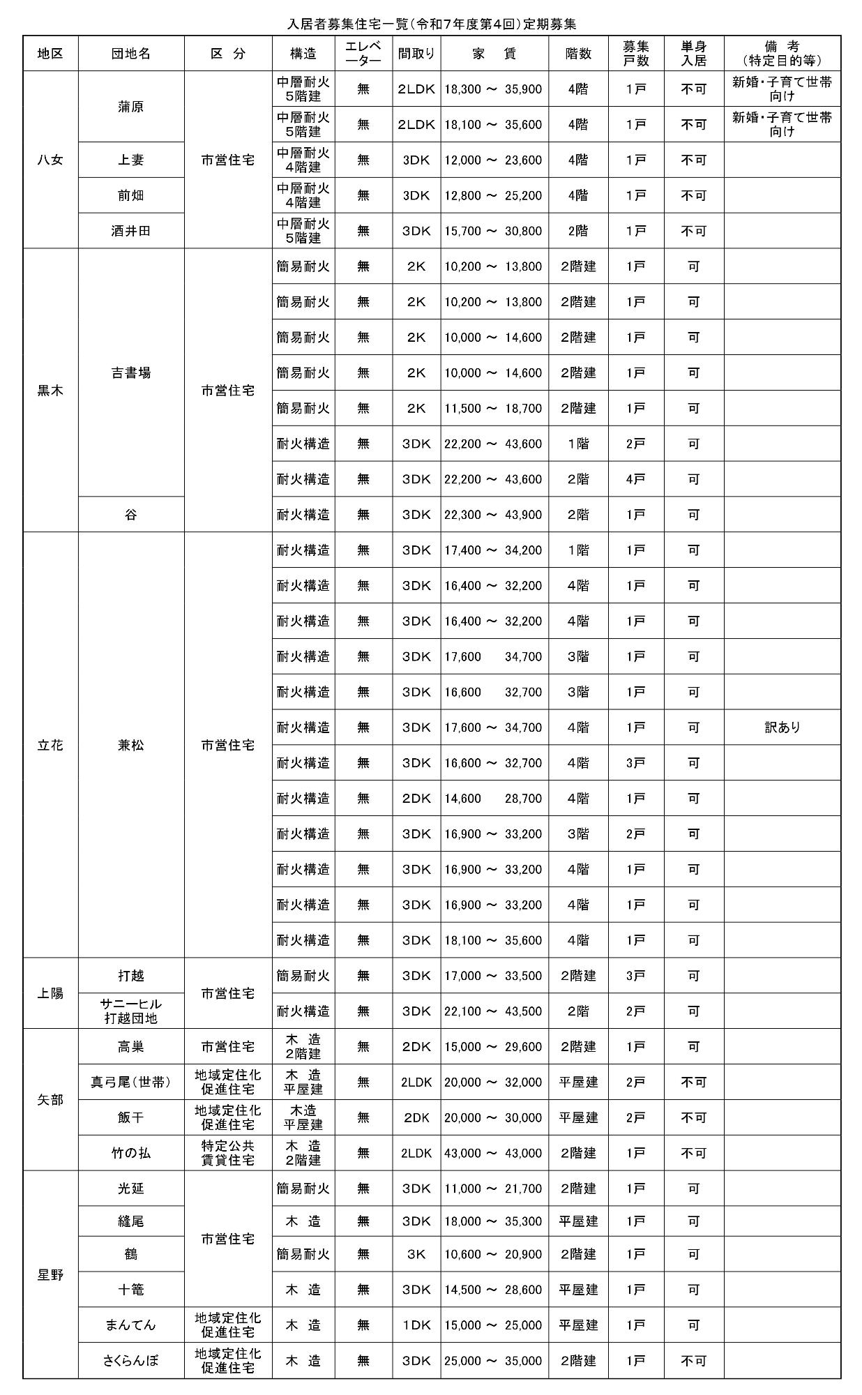 入居者募集住宅一覧(令和7年度第4回)定期募集 (PDFファイル: 39.8KB)