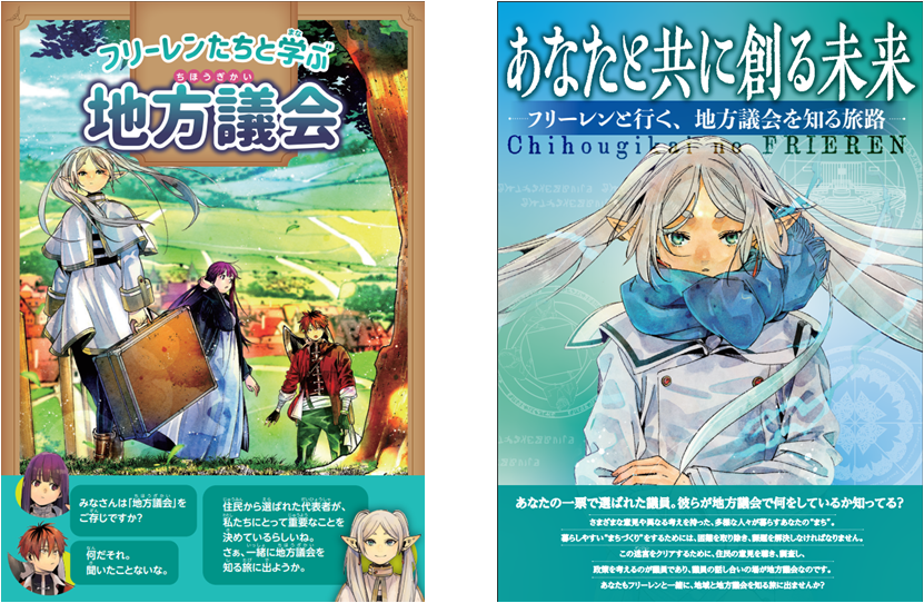 全国都道府県議会議長会、全国市議会議長会、全国町村議会議長会の三つの議長会では、これからの地域を担う子どもたちに、身近な課題を自分のこととして考え、議論し、合意形成を図ることの大切さや、地方議会・議員の役割を周知するため、子どもたちや若者に人気の漫画『葬送のフリーレン』のキャラクターを使用した主権者教育用リーフレットを作成しました。