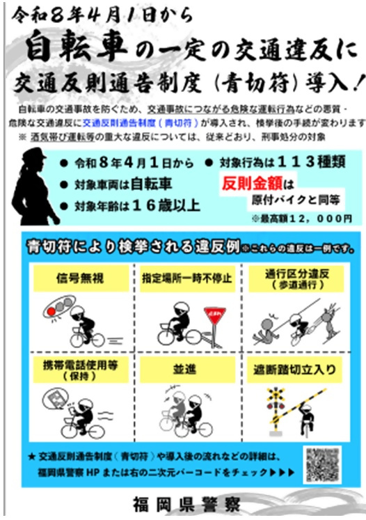 令和8年4月1日から自転車の交通事故を防ぐため、交通事故につながる危険な運転行為などの悪質・危険な交通違反に交通反則通告制度(青切符)が導入され、検挙後の手続きが変わります。