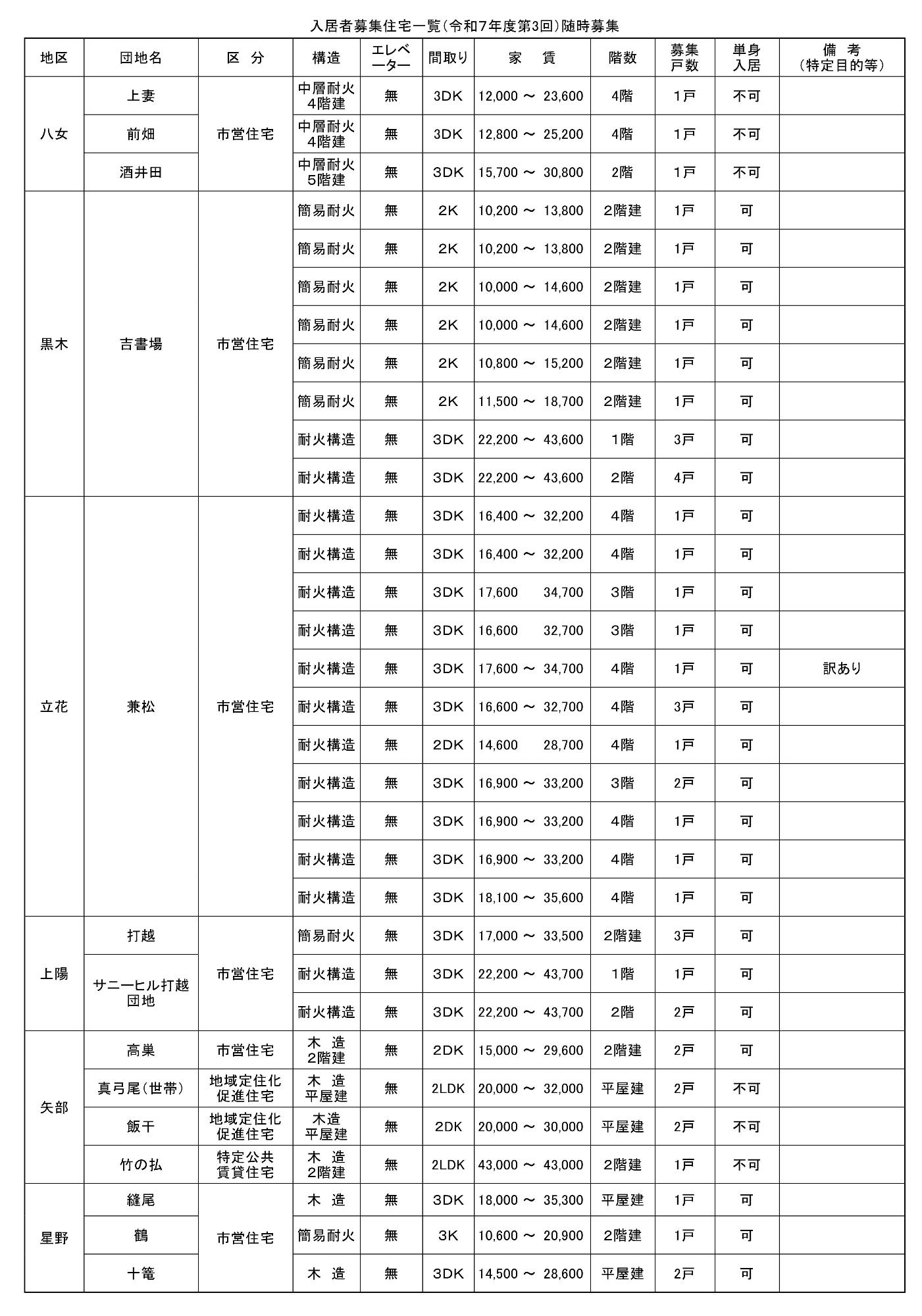 入居者募集住宅一覧(令和7年度第3回)随時募集 (PDFファイル: 36.0KB)