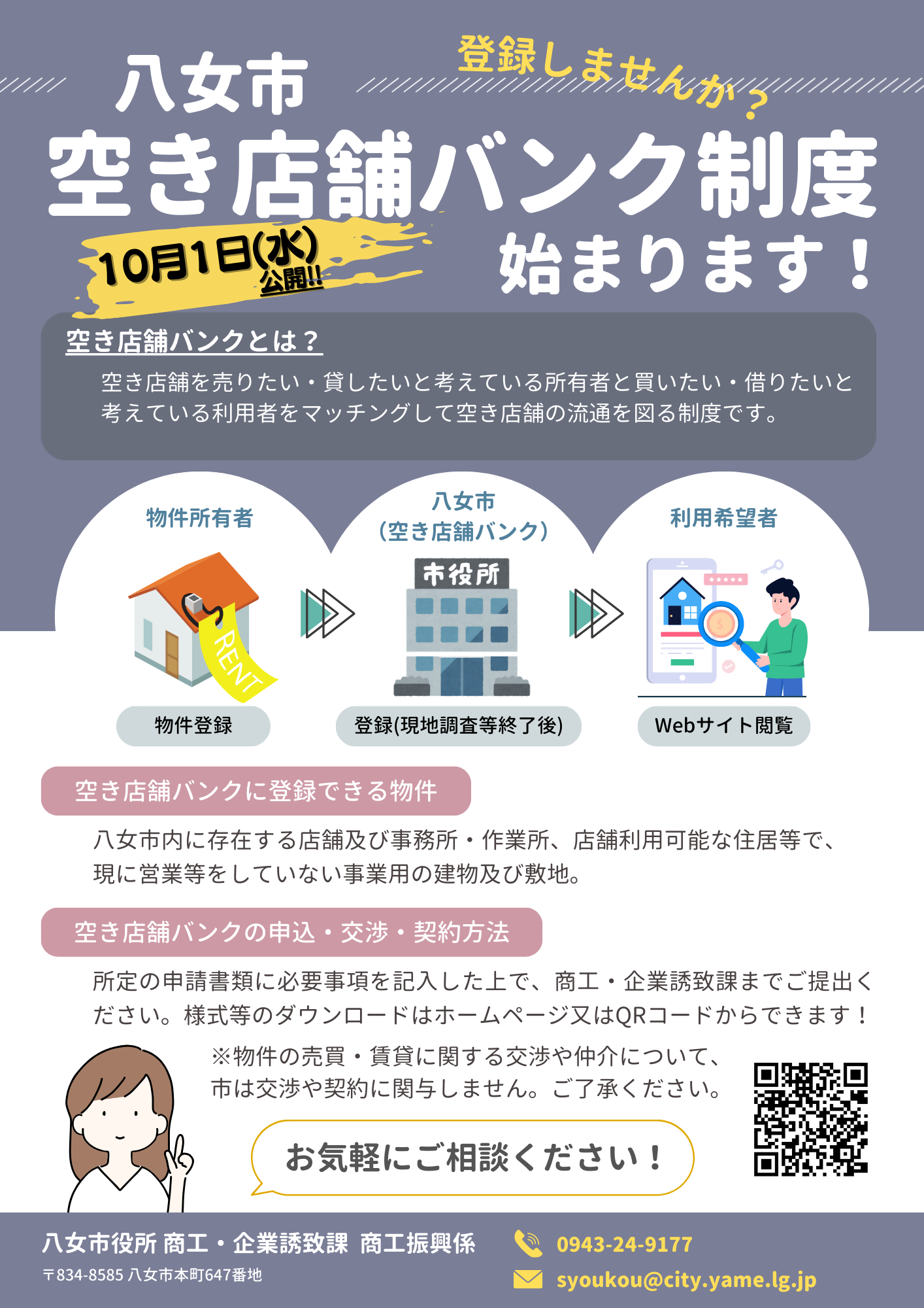 八女市内で空き店舗を売りたい・貸したいと考えている所有者と買いたい・借りたいと考えている利用者をマッチングして空き店舗の流通を図る制度です。