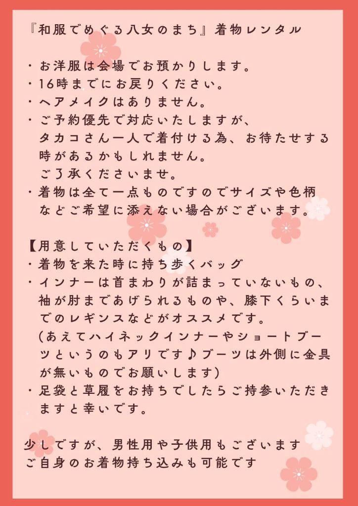 八女福島の町並みを和服で散策してみませんか。和服一式のレンタルと着付けを行います。袴、子ども用着物もご用意しています。(予約優先)
