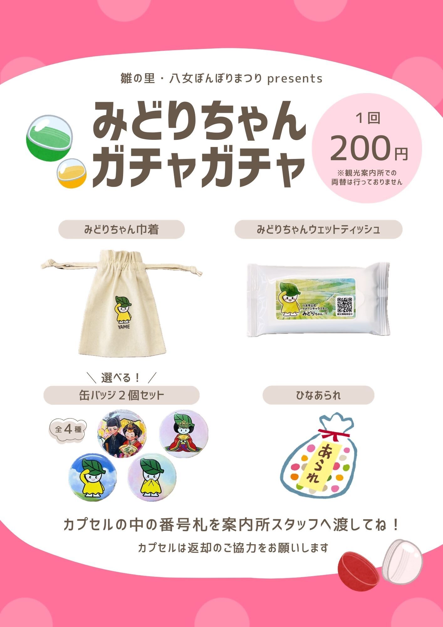 ぼんぼりまつり期間限定でみどりちゃん(八女市公式マスコットキャラクター)のグッズなどがあたるガチャガチャが登場!
