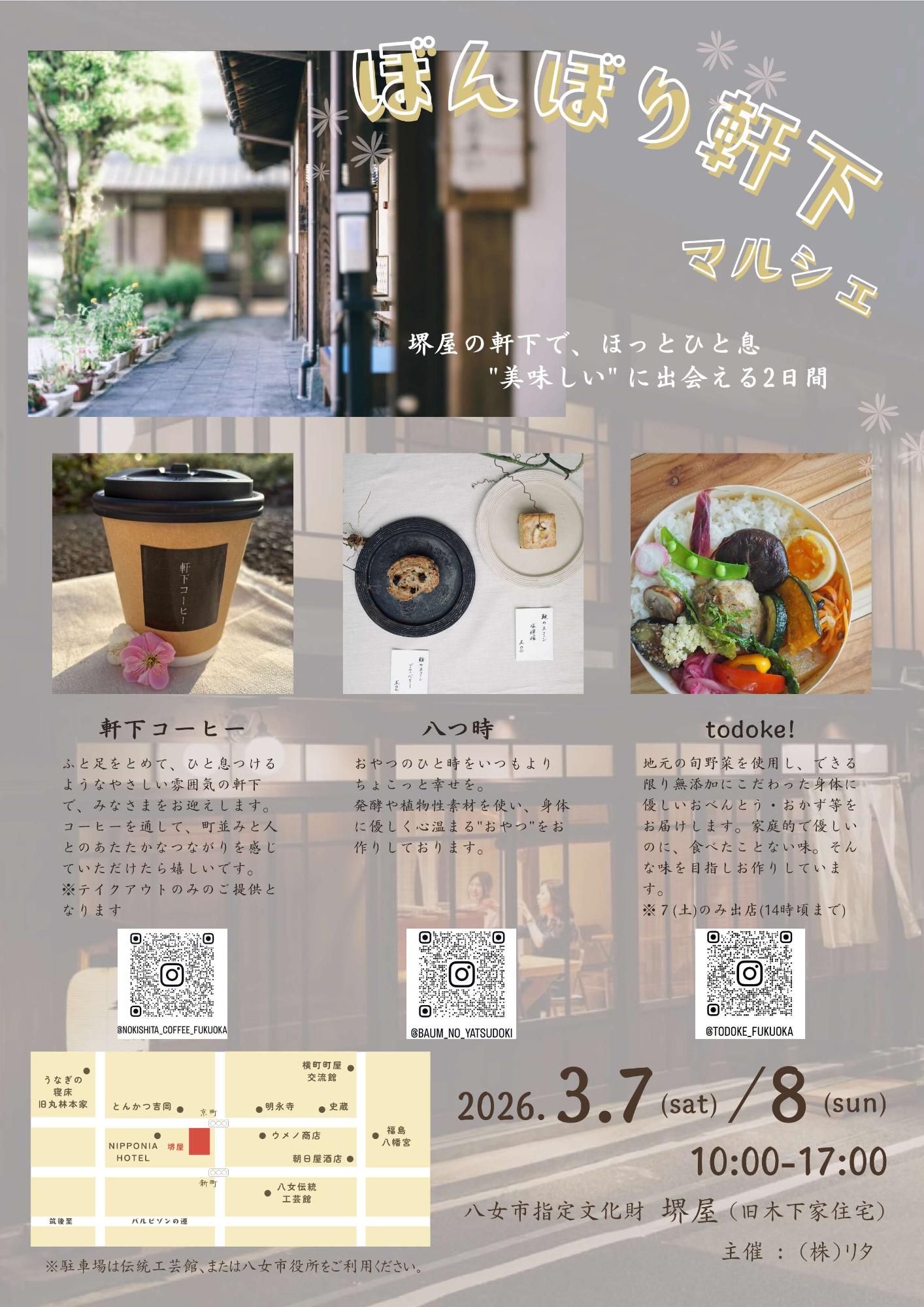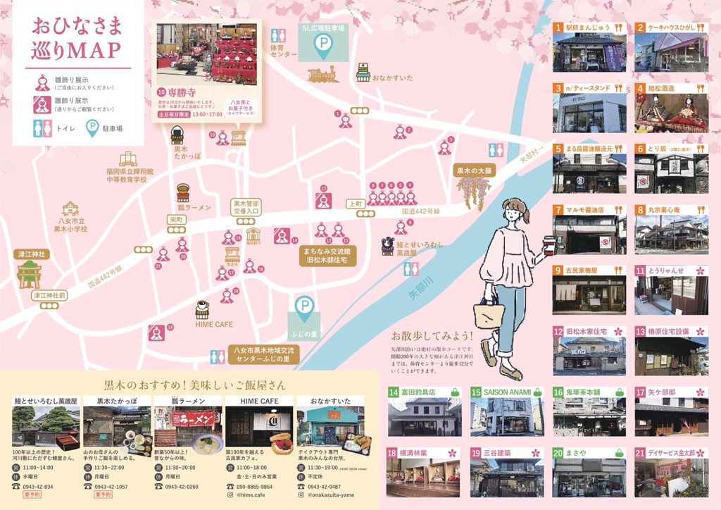 - 八女市黒木町の伝統的建築物保存地区群周辺にて雑貨、グルメのマルシェを行います。町並みに展示されたおひなさまを楽しみながら回れるスタンプラリーも開催!
