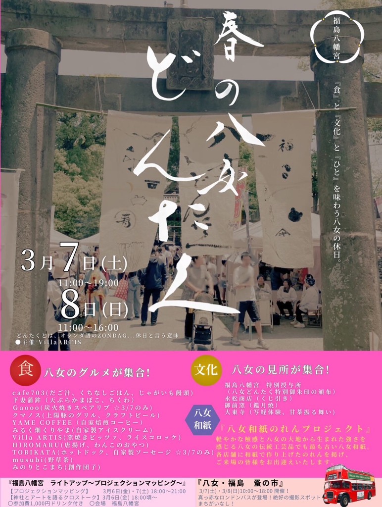 江戸時代から続く白壁通りの福島八幡宮参道にて八女の美味しい地酒と食べ物や雑貨を楽しむマルシェを開催。福島八幡宮参道では八女のグルメ、人、文化に出会える八女どんたくを開催。おひなさま巡りと一緒にお楽しみください。