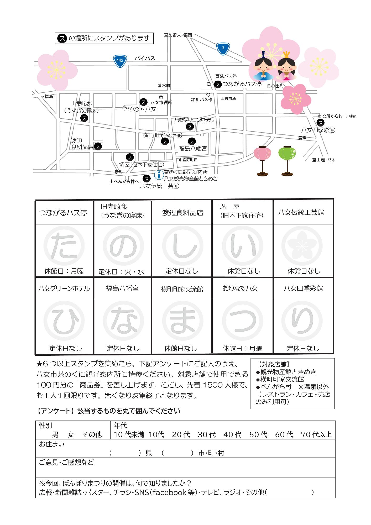 八女ならではの雛人形にふれていただきながら、お雛様めぐり、スタンプラリーをお楽しみください。会場に10か所のスタンプラリースポットを設置しています。6個以上スタンプを押し、必要事項をご記入の上、八女市茶のくに観光案内所へお持ちくいただくと対象店舗のお買い物券100円分をプレゼントします。