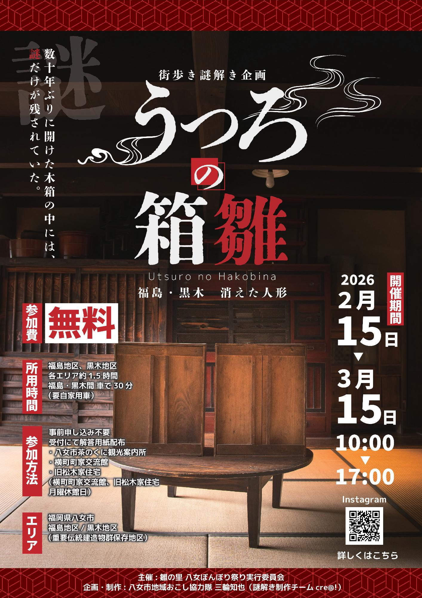 消えた箱雛を探す謎解きに挑戦!福島と黒木を歩きながら手がかりを見つけていく、気軽に楽しめる街歩きイベントです。解答用紙は茶のくに観光案内所ほかで配布。