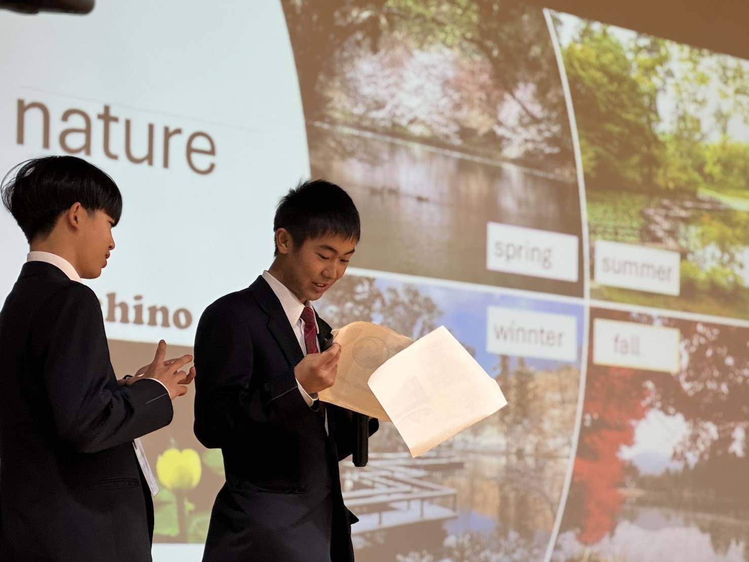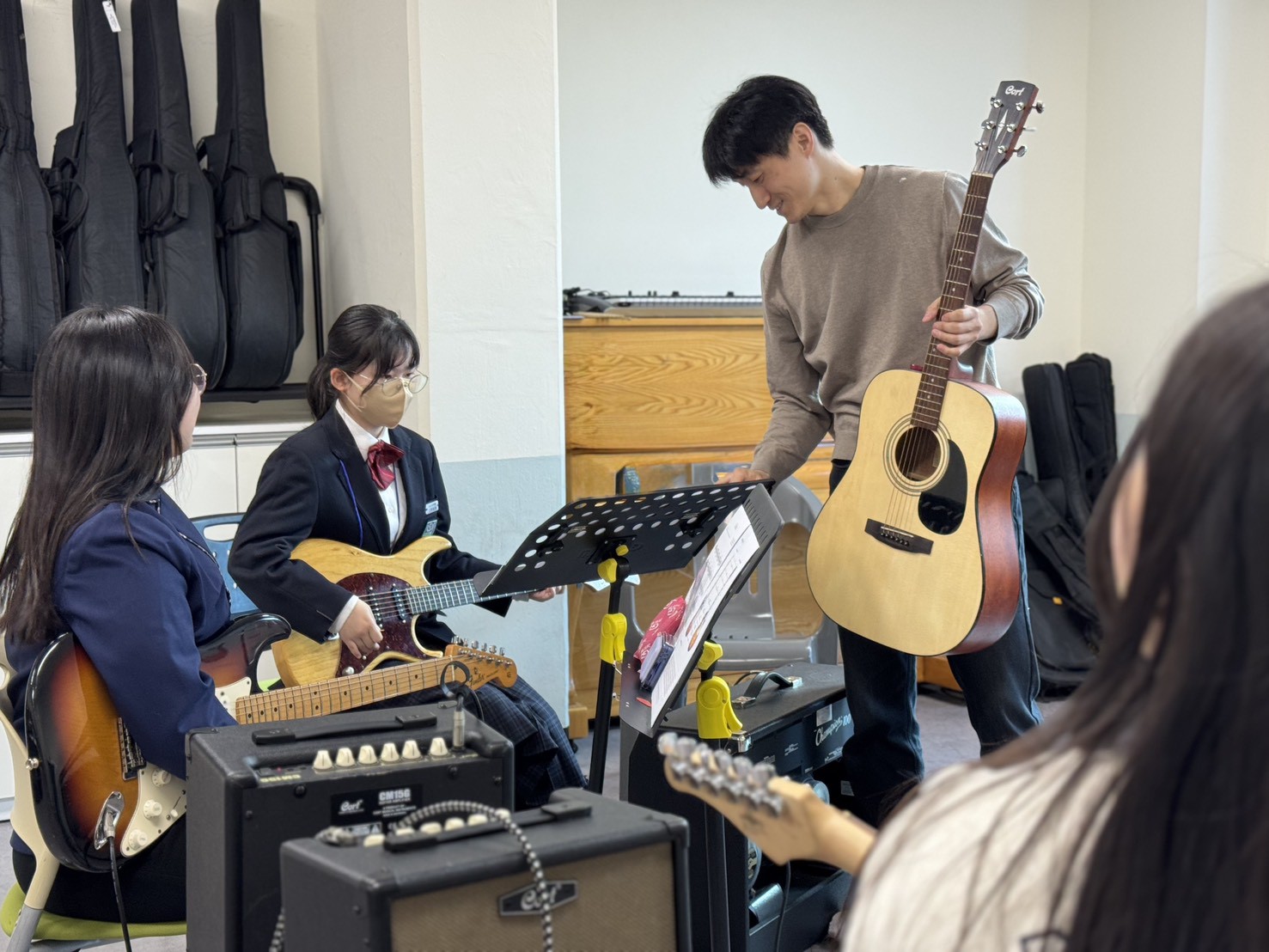 交流会では、みさき学園の生徒たちがジャンモク芸術中学校の全校生徒を前に、英語で八女市の自然や観光施設などの魅力を紹介するプレゼンテーションを行いました。 また、給食の時間には現地の生徒たちと共にテーブルを囲み、音楽を共通言語とした演奏交流も実施。英語や身振り手振りを交えながら、終始笑顔でコミュニケーションをとり、両校の生徒が心から交流を楽しんでいる様子が見られました。