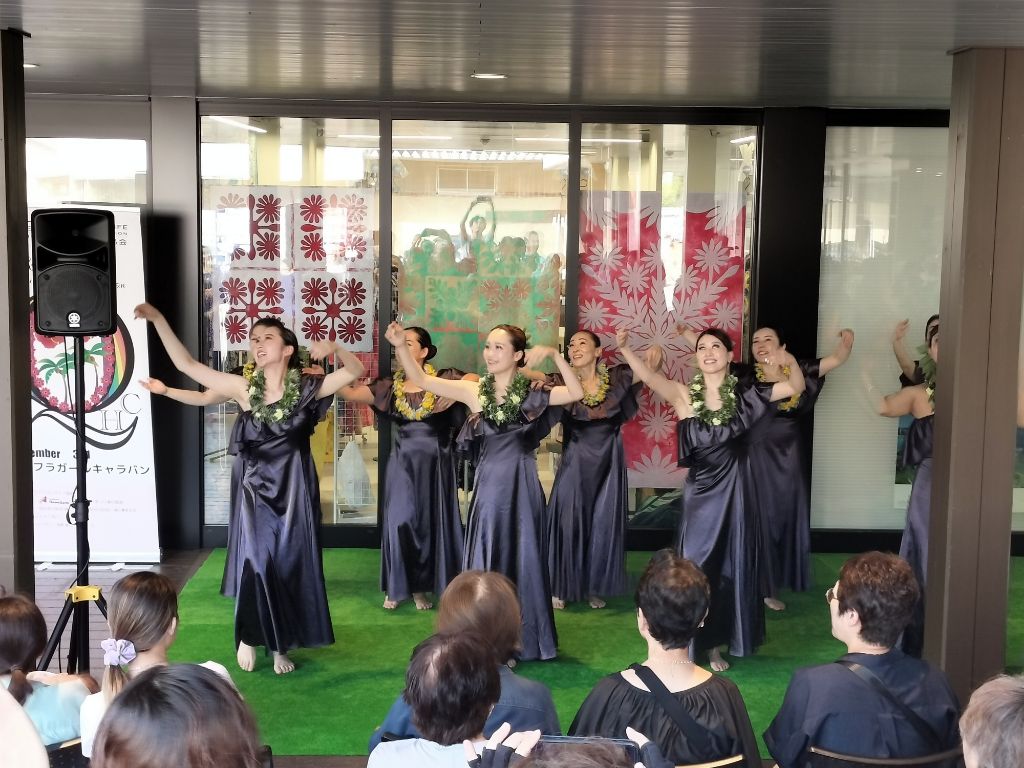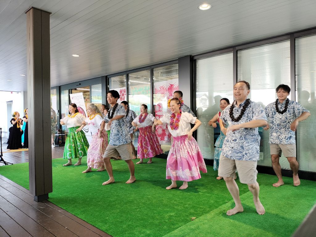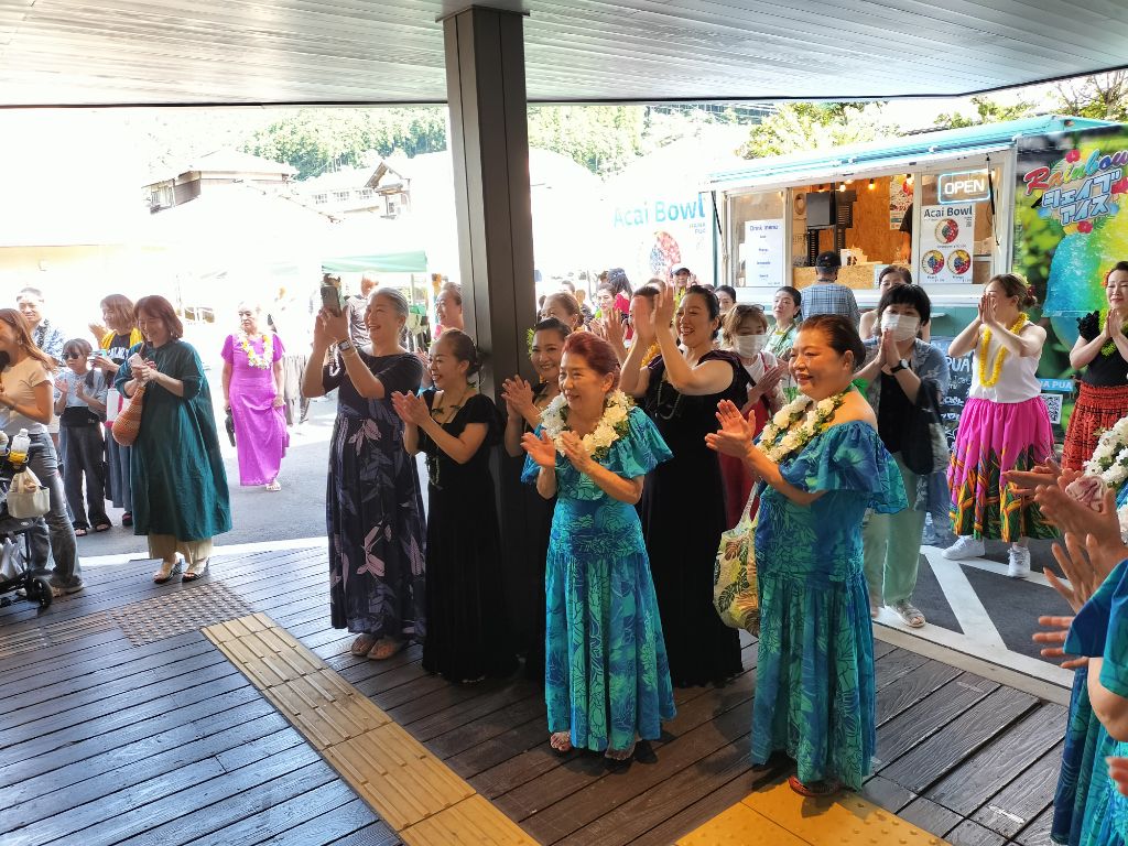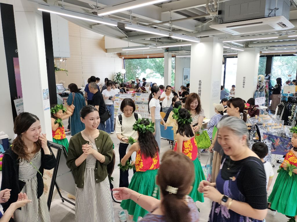 また、2日間にわたって延べ20団体のフラステージが行われ、観客を盛り上げました。マルシェでは、ハワイアンキルトをはじめ、ハワイテイストのマラサダやアサイーボウル、中村学園大学の学生によるクッキーなどが販売され、会場はハワイの雰囲気に包まれました。