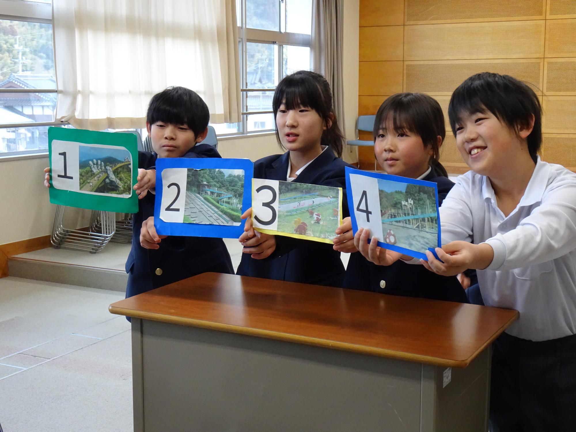 今年度2回目となる今回は、画面越しに「久しぶり」と声を掛け合うなど、再会を喜ぶ和やかな雰囲気で始まりました。まず、上陽北ぜい学園の生徒が上陽町に関する選択式クイズを、カミロイキ小学校の生徒がハワイに関する〇×クイズをそれぞれ出題し、正解発表のたびに画面越しに笑顔が広がりました。その後の質問コーナーでは、日本のアニメや歌について尋ね合う場面も見られました。さらに、上陽北ぜい学園の生徒がカメラの前で折り紙を折って披露するなど、リアルタイムの映像を通じたオンラインならではの交流を楽しみました。