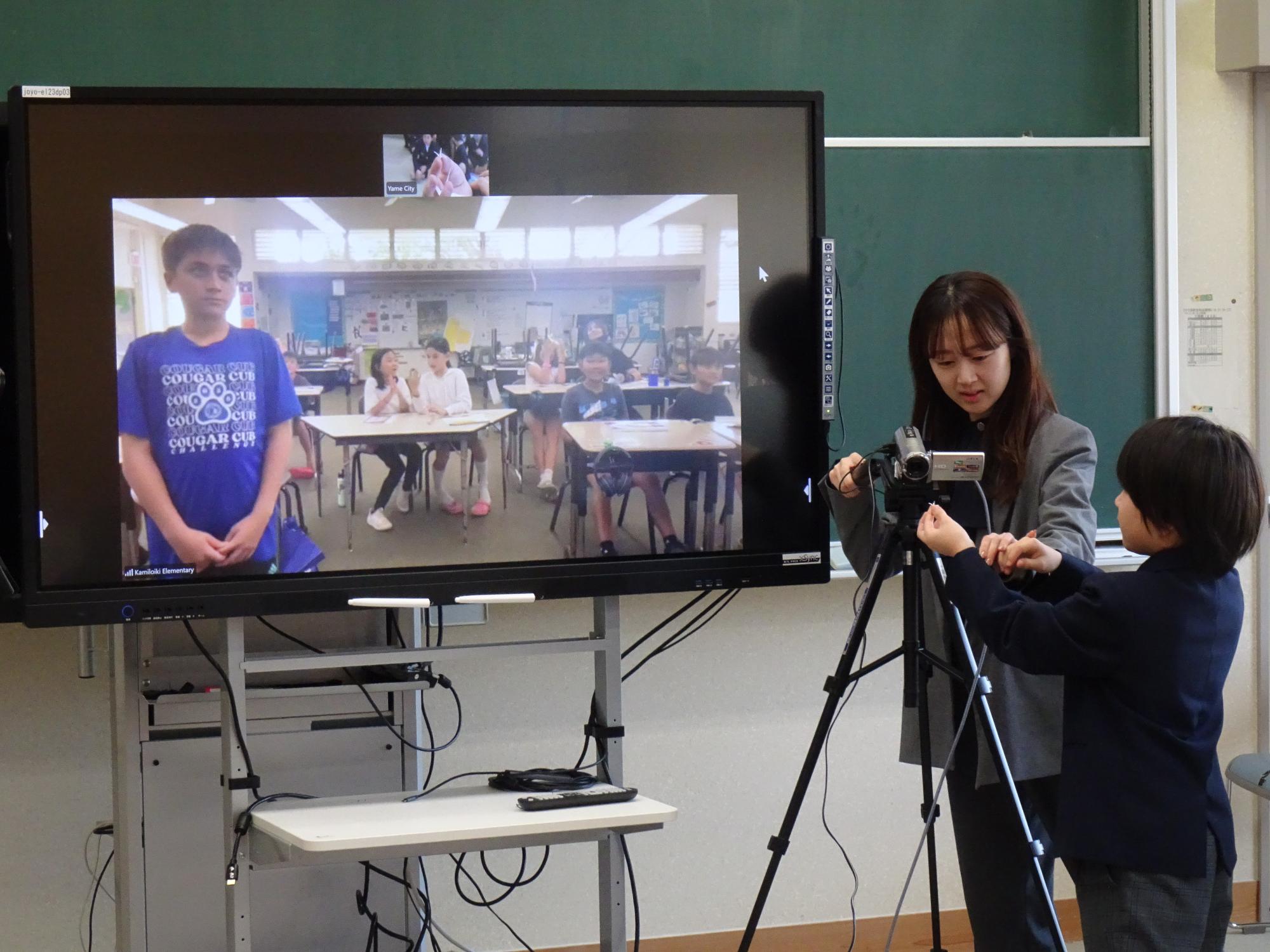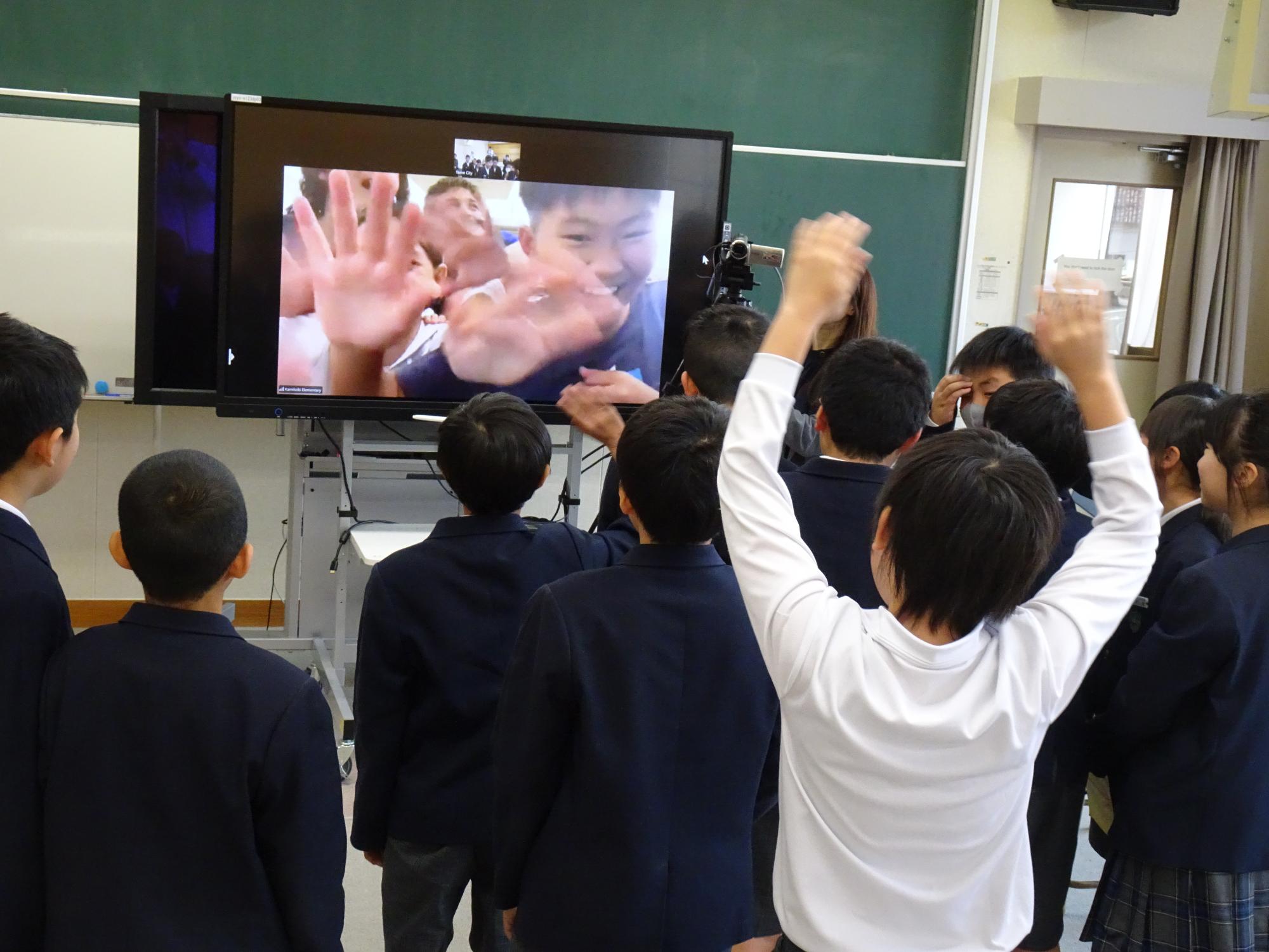 1月28日、上陽北ぜい学園の5年生15人が、ハワイ州のカミロイキ小学校の4・5年生9人とオンラインで交流しました。