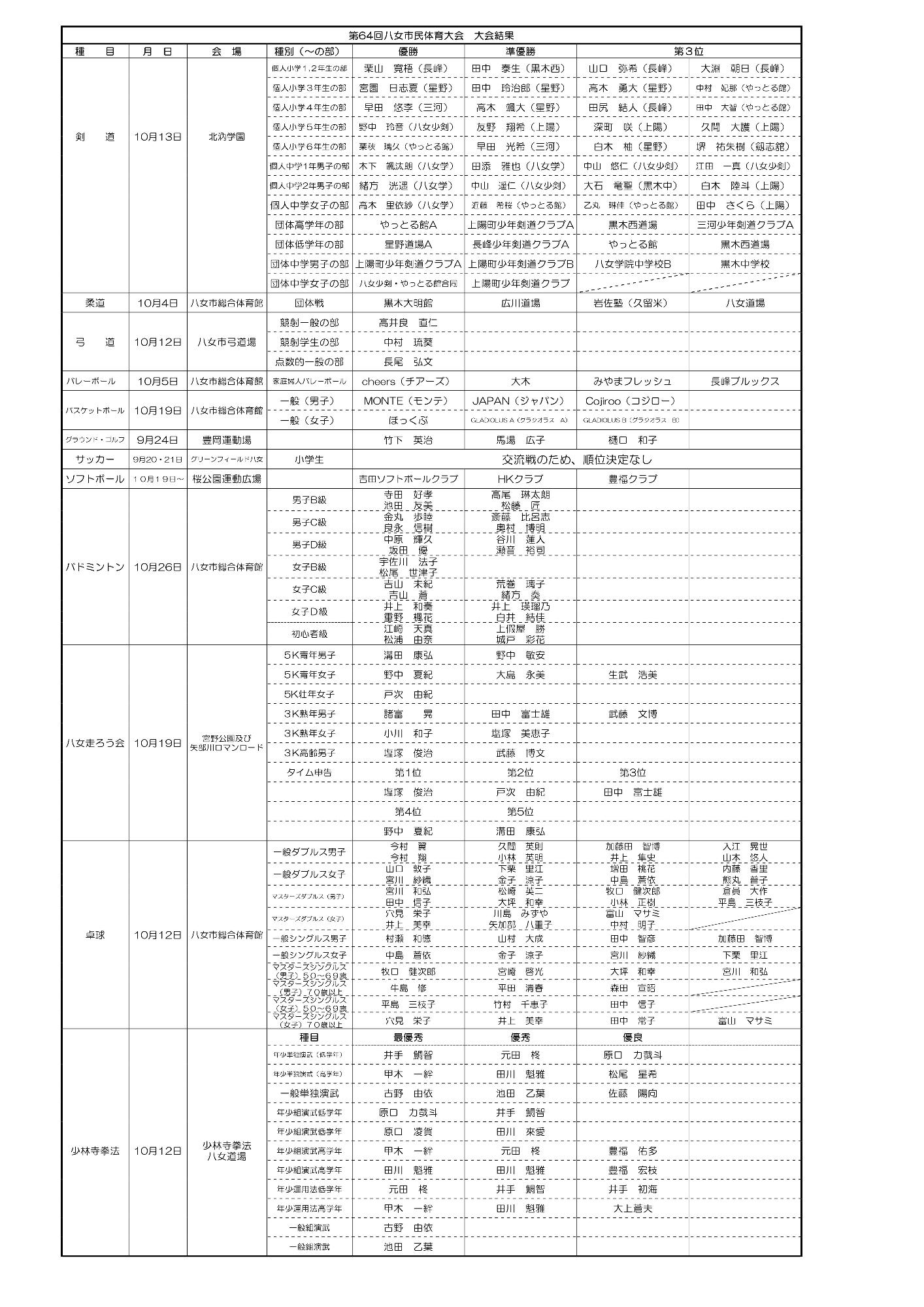 令和7年度八女市民体育大会について 令和7年度(第64回)市民体育大会への沢山のご参加ありがとうございました。 各競技の結果については以下のとおりです。 各競技の開催日時は以下のとおりです。 この記事に関するお問い合わせ先 スポーツ振興課 スポーツ振興係〒834-0023 福岡県八女市馬場434番地電話番号:0943-24-1230ファックス:0943-24-0029お問い合わせはこちら