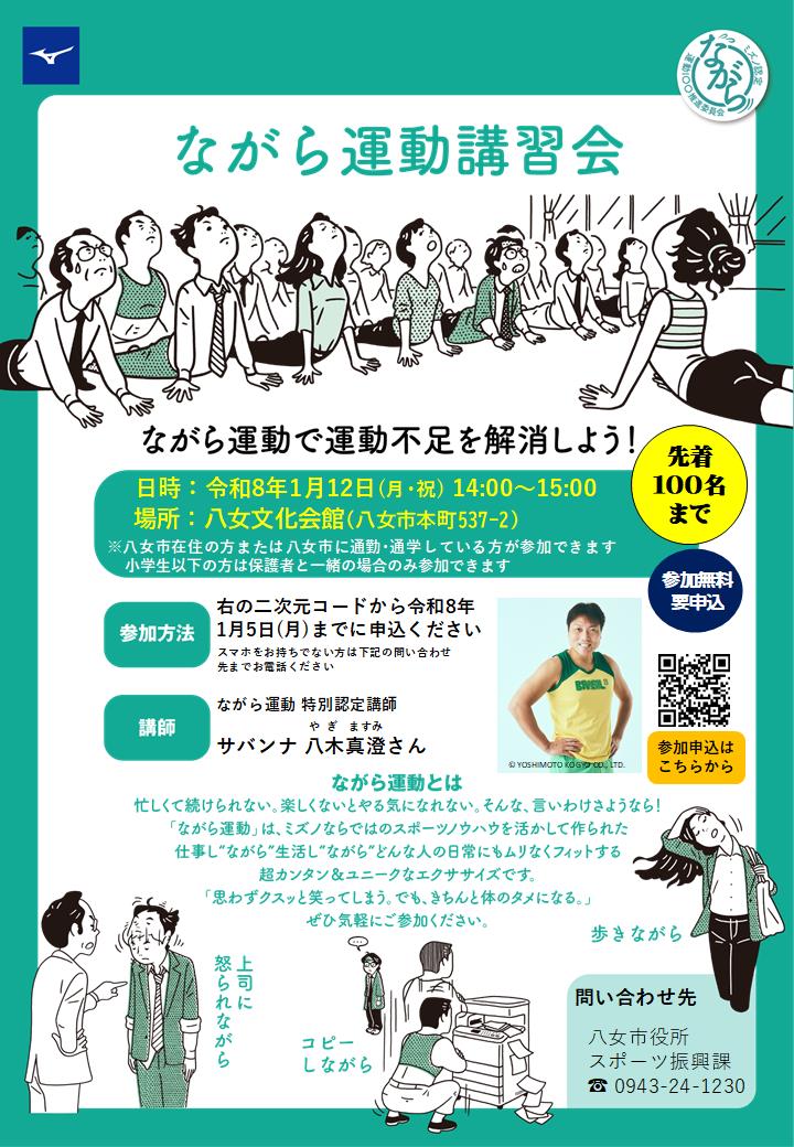 今回は、令和7年度八女市スポーツ健康づくり事業の一環として、ながら運動 特別認定講師の サバンナ 八木真澄さん を講師に招き、楽しく笑顔溢れる「ながら運動講習会」を開催します。