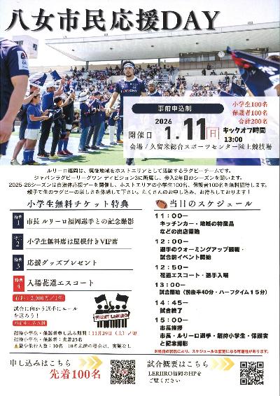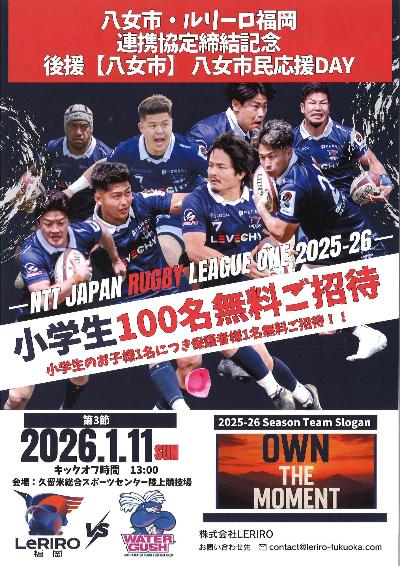 うきは市を拠点に活動するラグビーチーム・ルリーロ福岡が八女市内の小学生と保護者(先着100名ずつ、合計200名)を無料招待されます。