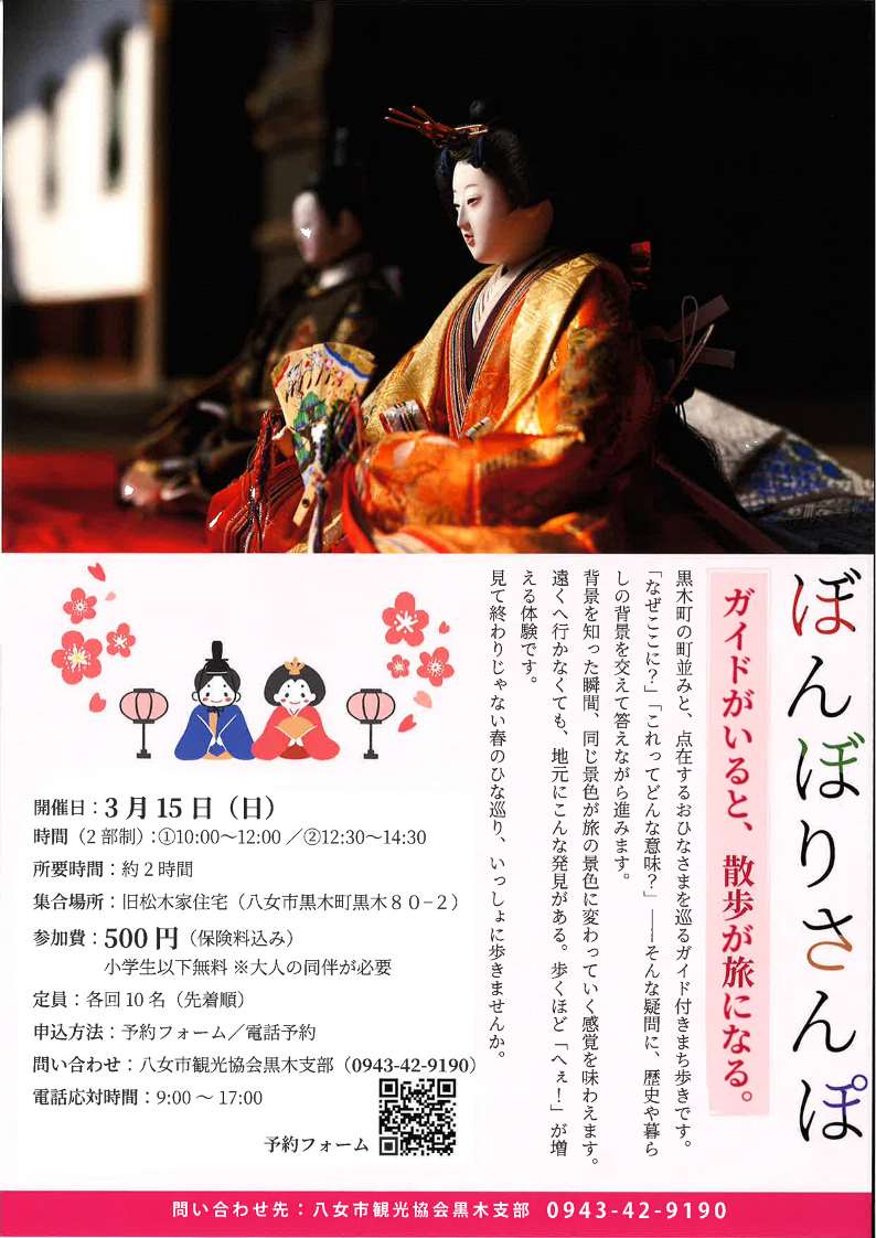 立ち並ぶ居蔵造(いぐらづくり=土蔵造)の町家や酒蔵、清流矢部川の水辺など、見どころの多い黒木の町並み保存地区 町並みに飾られたおひなさまを巡るガイド付きまち歩きです。まちの歴史や廻水路にまつわる秘話など話しながら、黒木の町並みをガイドさんが楽しくご案内します 【出発時刻】 1回目:10時00分~ 2回目:12時30分~ 【所要時間】約120分
