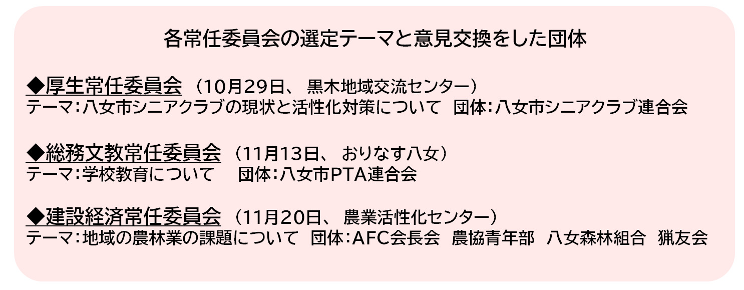 今回は、各常任委員会がテーマを選定し、各団体および参加された市民の方と分野別意見交換会を行いました。テーマに沿って、課題や政策について市民の声を直接聞き、議員の政策立案能力を強化するための重要な機会となりました。