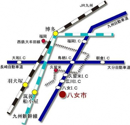 (JR鹿児島本線)博多駅→羽犬塚駅→堀川バス→「八女学院前」下車