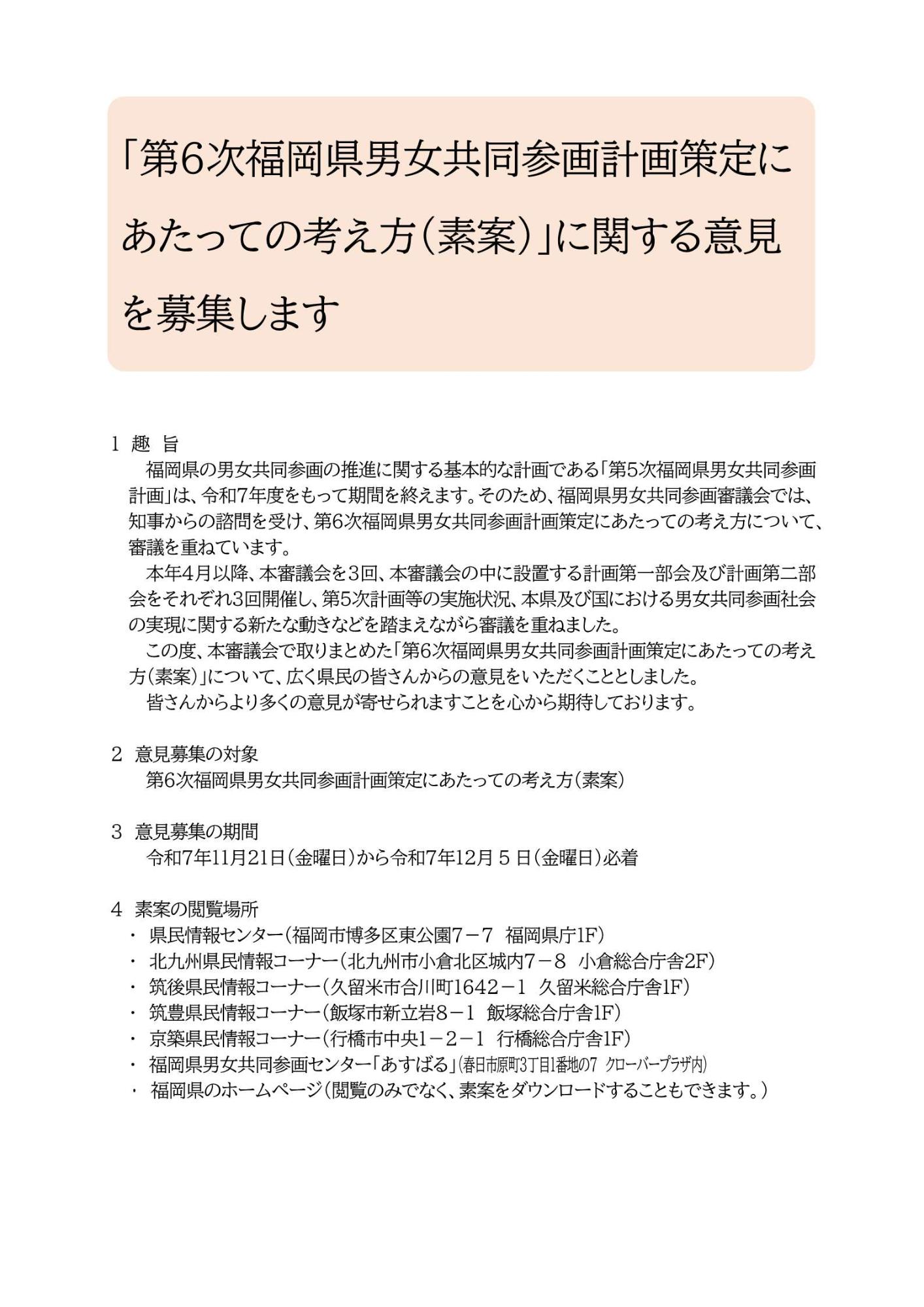 この度、本審議会で取りまとめた「第6次福岡県男女共同参画計画策定にあたっての考え方(素案)」について、広く県民の皆さんからの意見をいただくこととしました。